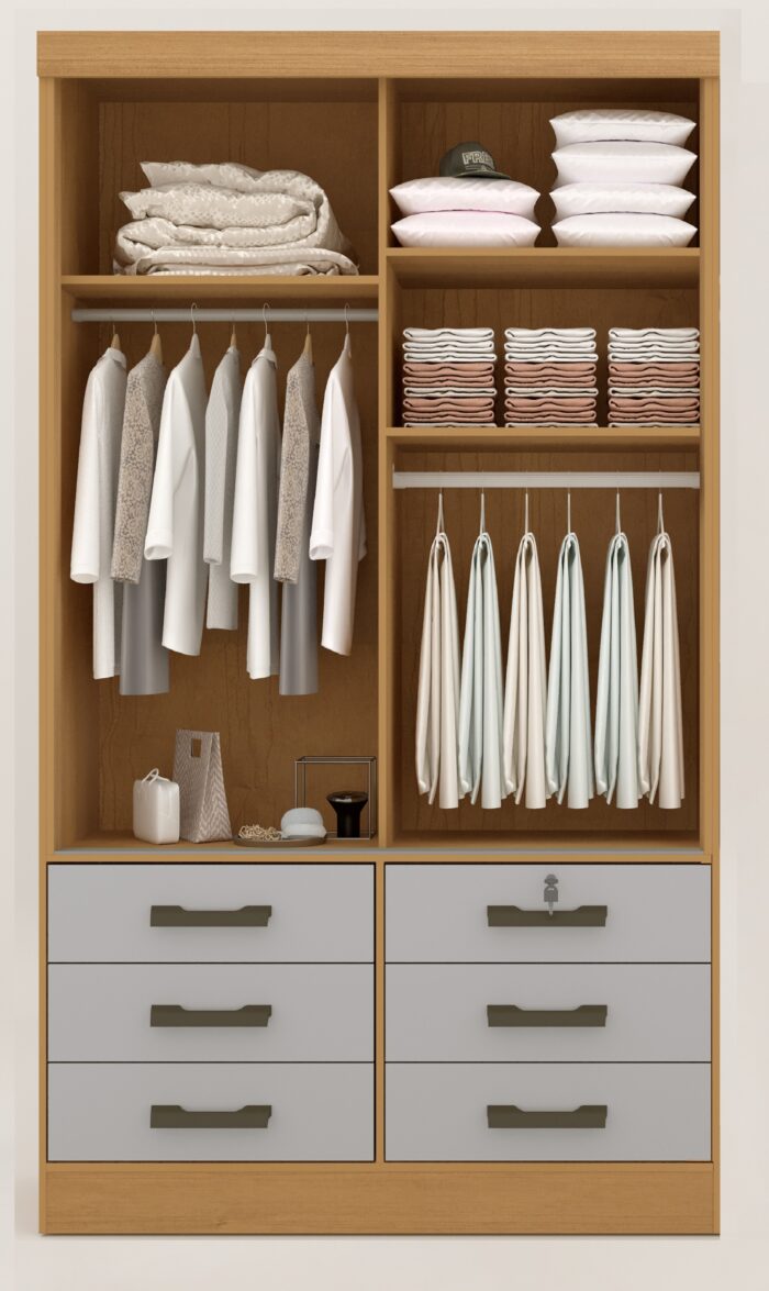 Roupeiro Meridian 2 portas, Possui trilho antiqueda, Cabideiro e calceiro metálico, tendo espaço interno para arrumação de roupas e cama e contando ainda com 06 amplas gavetas com puxadores e corrediças telescópicas, com várias cores para uma harmonização perfeita no seu ambiente.