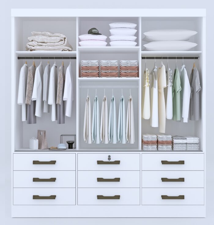 Roupeiro Meridian 3 portas, Possui trilho antiqueda, Cabideiro e calceiro metálico, tendo espaço interno para arrumação de roupas e cama e contando ainda com 09 amplas gavetas com puxadores e corrediças telescópicas, com várias cores para uma harmonização perfeita no seu ambiente.
