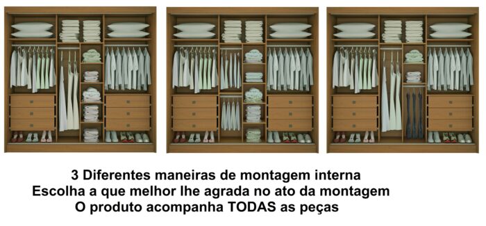 Roupeiro New Dallas 3 portas, produto em 100% MDF com amplas portas de correr ,cabideiro e calceiro metálico, tendo espaço interno para arrumação de roupas e cama e contando ainda com 06 amplas gavetas com puxadores e corrediças telescópicas,3 opções de montagem interna no mesmo produto, com várias cores para uma harmonização perfeita no seu ambiente.